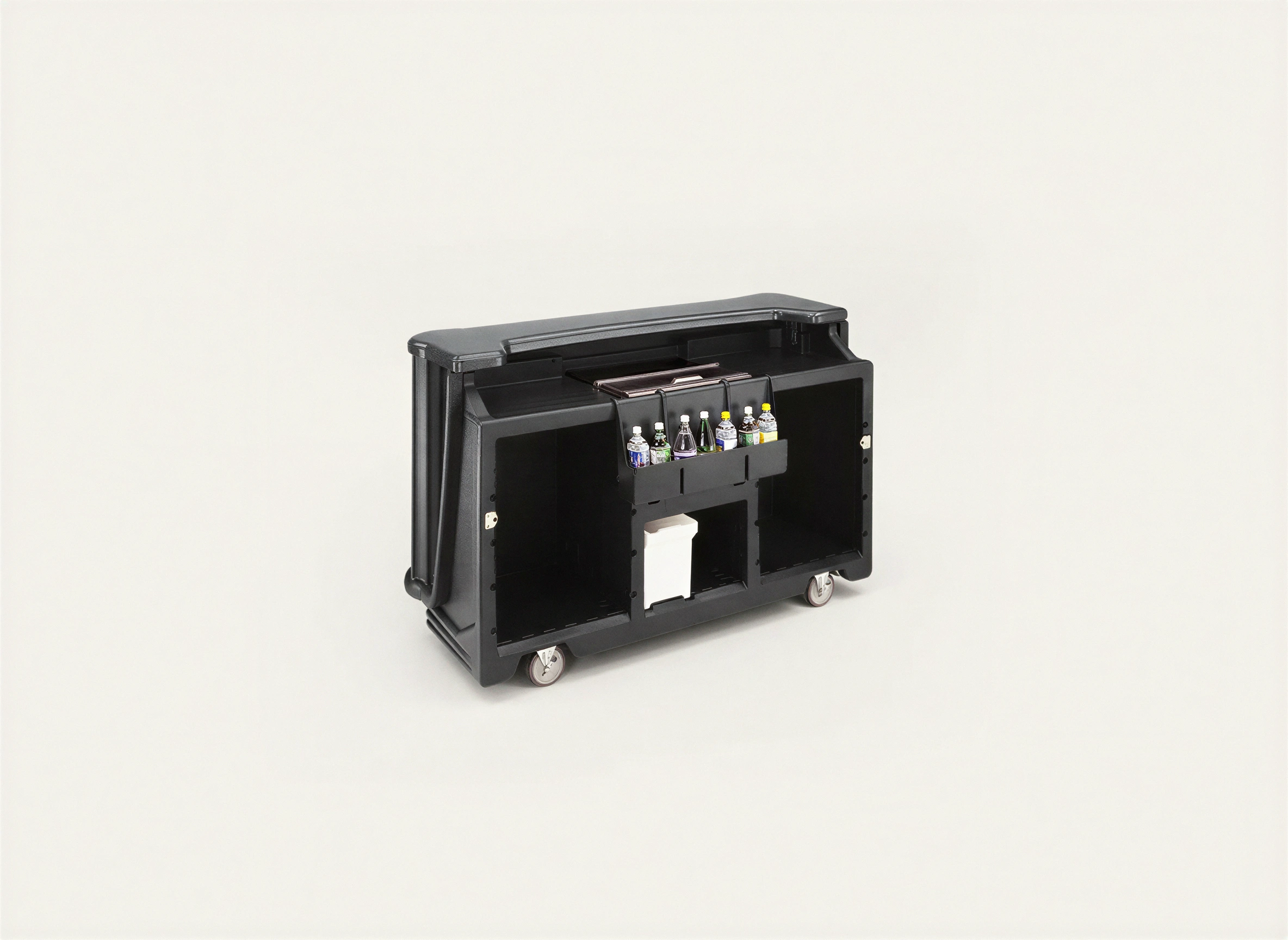 This model’s built-in cold plate helps keep your ice cold longer, and is designed to direct melted water into drainage channels that lead to its waste water bin. Rounded corners and molded compartments help absorb shock, protecting your bottles and glassware during transportation.